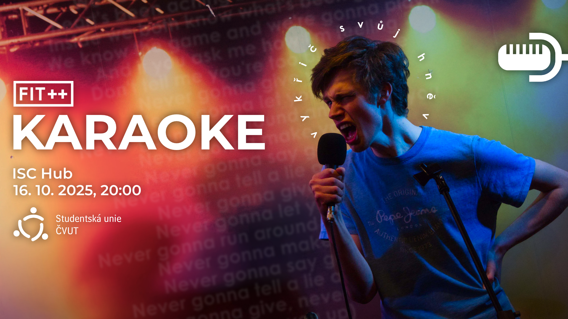 Podzimní semestr už je v plném proudu, ale nezoufej! Čeká nás karaoke, ta nejlepší příležitost, jak se odreagovat a pobavit. Přijď 16. 10. v 20:00 do ISC Hubu a ukaž, co v tobě je! Pokud se necítíš na zpěv, tak se s tebou samozřejmě rádi i jen napijeme.
