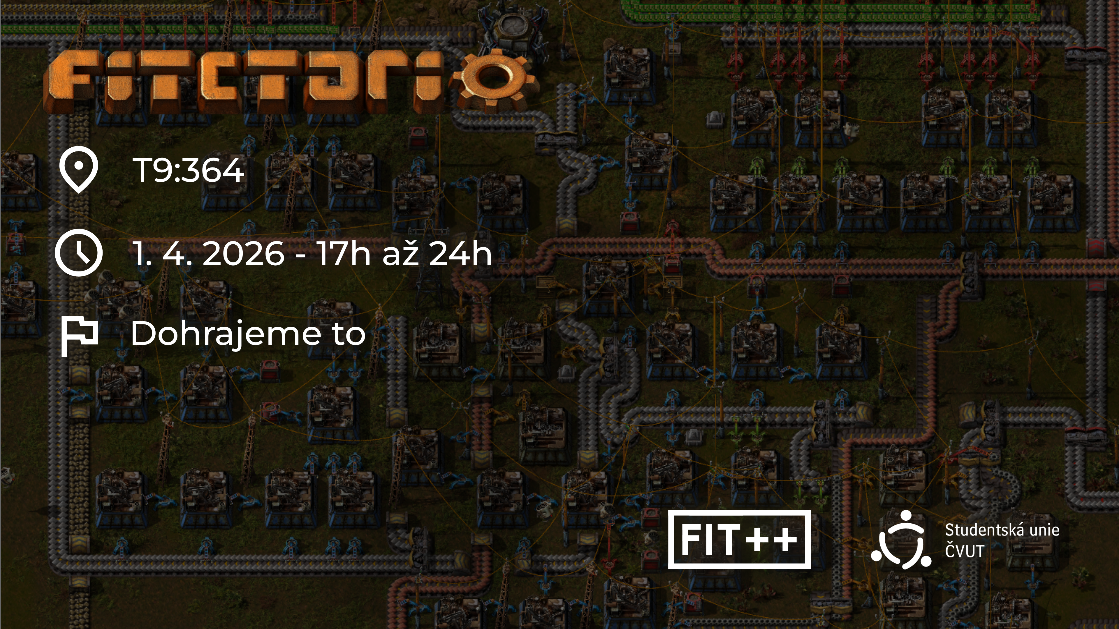 Přijďte si dostat Factorio ze systému! Už 1. 4. (ne, není to aprílový vtip) nás čeká akce FITctorio, večer dedikovaný jednomu kompletnímu průchodu touto návykovou hrou. A o týden později bude LAN Party, takže se můžete na atmosféru nažhavit už nyní. Účastníci budou odměněni Kofolou.