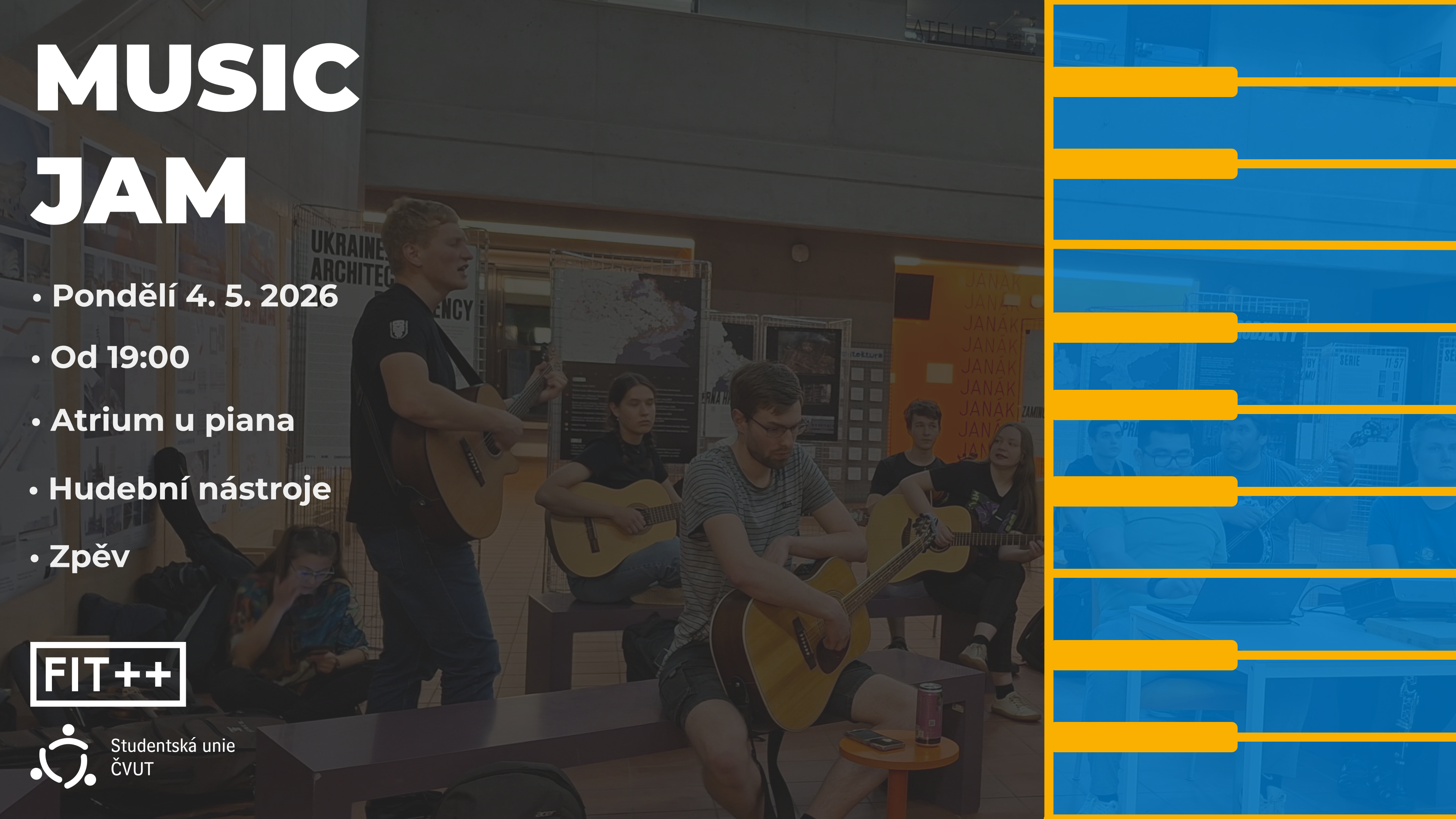 Zkouškové se blíží a je čas si na chvíli vydechnout! Přijďte 4. května do atria na další Music Jam 🎶 Vezměte s sebou svůj oblíbený nástroj a partu kamarádů. U piana nás čeká pohodový večer plný hudby, improvizace a dobré nálady. Těšíme se na vás! 🎵